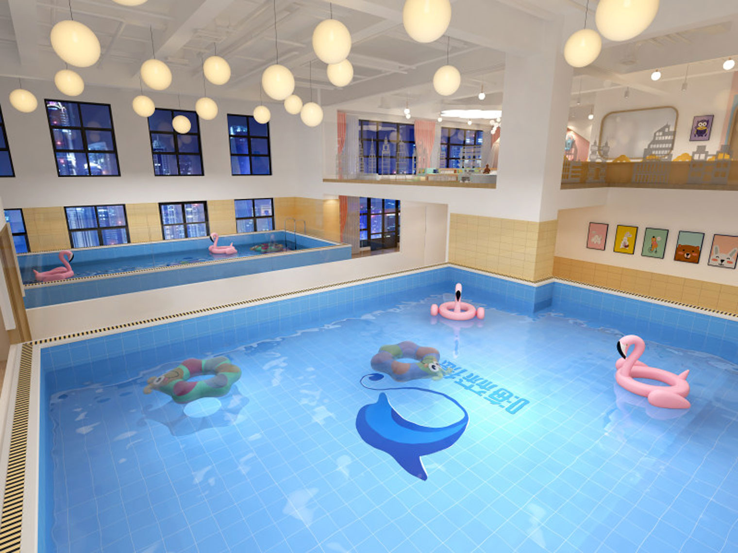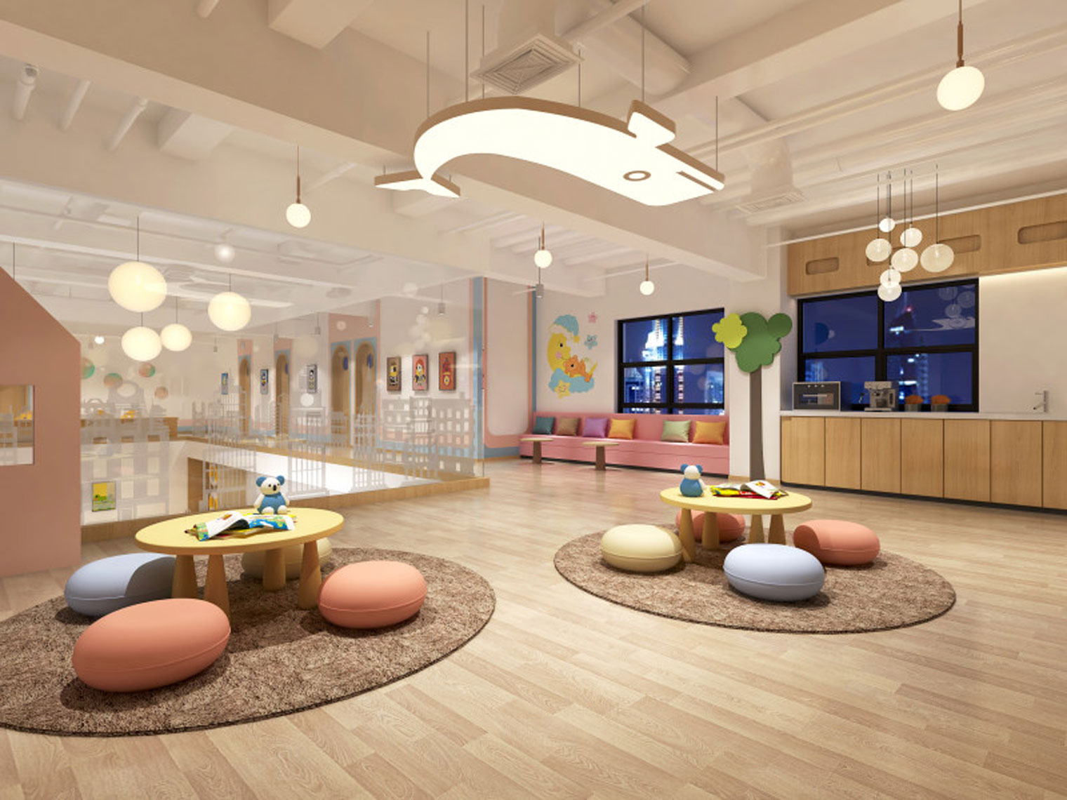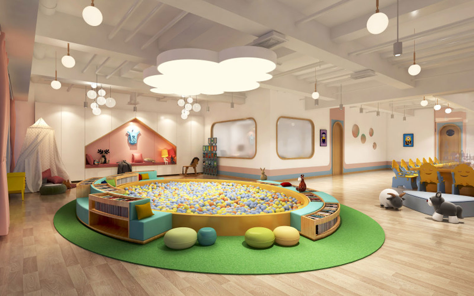 設(shè)計風格:設(shè)計師采用客戶固有的設(shè)計元素與VI進行聯(lián)想創(chuàng)作,以簡潔大方的方式展現(xiàn)現(xiàn)代簡約而高檔的早教設(shè)計,通過不同房間的不同色彩進行刺激孩子的視覺感官,從而達到歡悅而活躍的教育氛圍