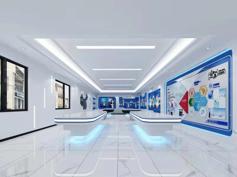 展廳,藍(lán)白配色凸顯科技感,墻面展板結(jié)合多媒體設(shè)備,全面展示企業(yè)信息,展示臺(tái)造型新穎,燈光烘托氛圍,打造出一個(gè)充滿科技與未來感的展示空間。