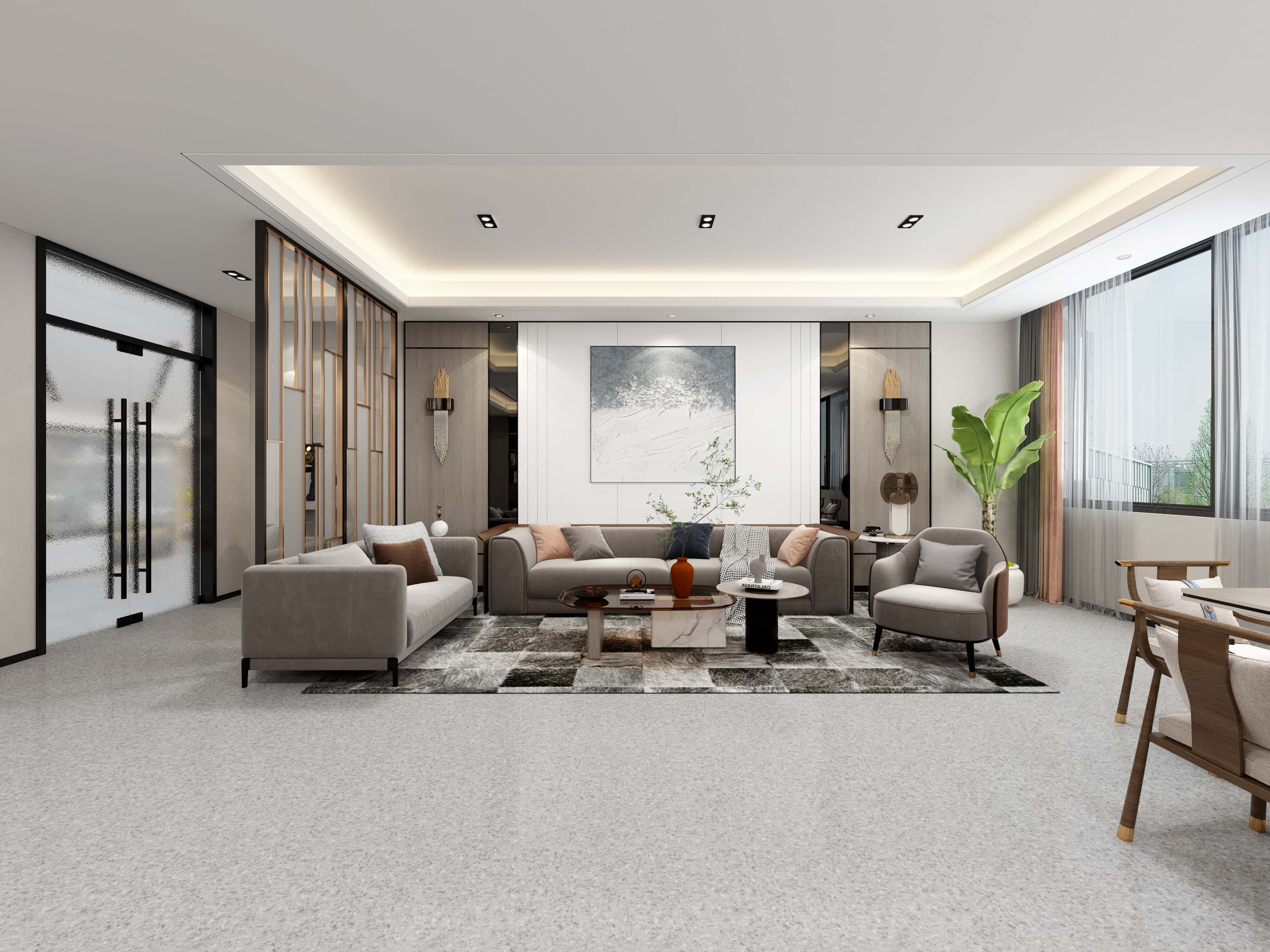 接待室,淺灰地毯搭配柔和燈光,營(yíng)造舒適氛圍,沙發(fā)、茶幾等家具擺放錯(cuò)落有致,藝術(shù)畫作提升空間格調(diào)。