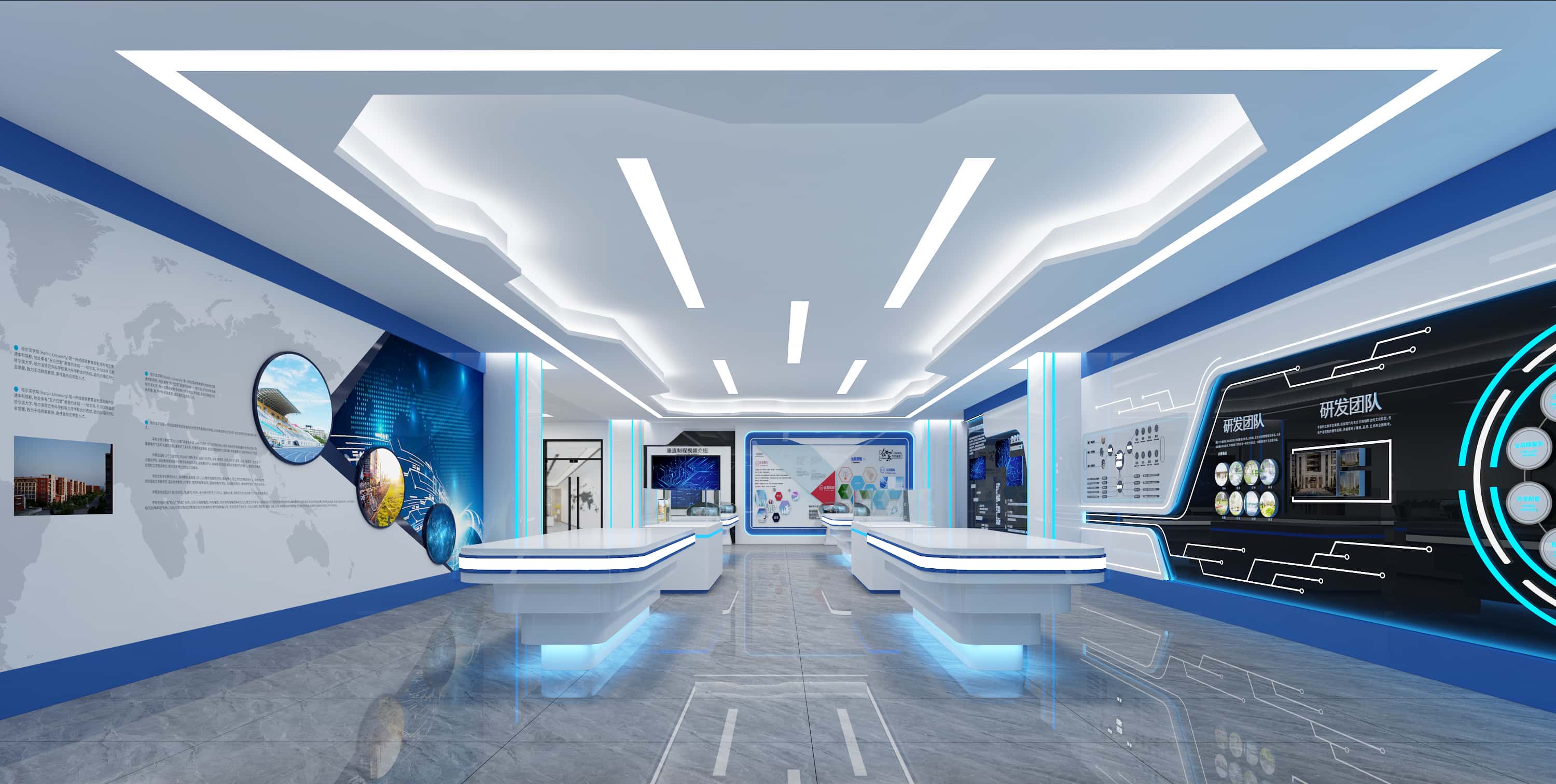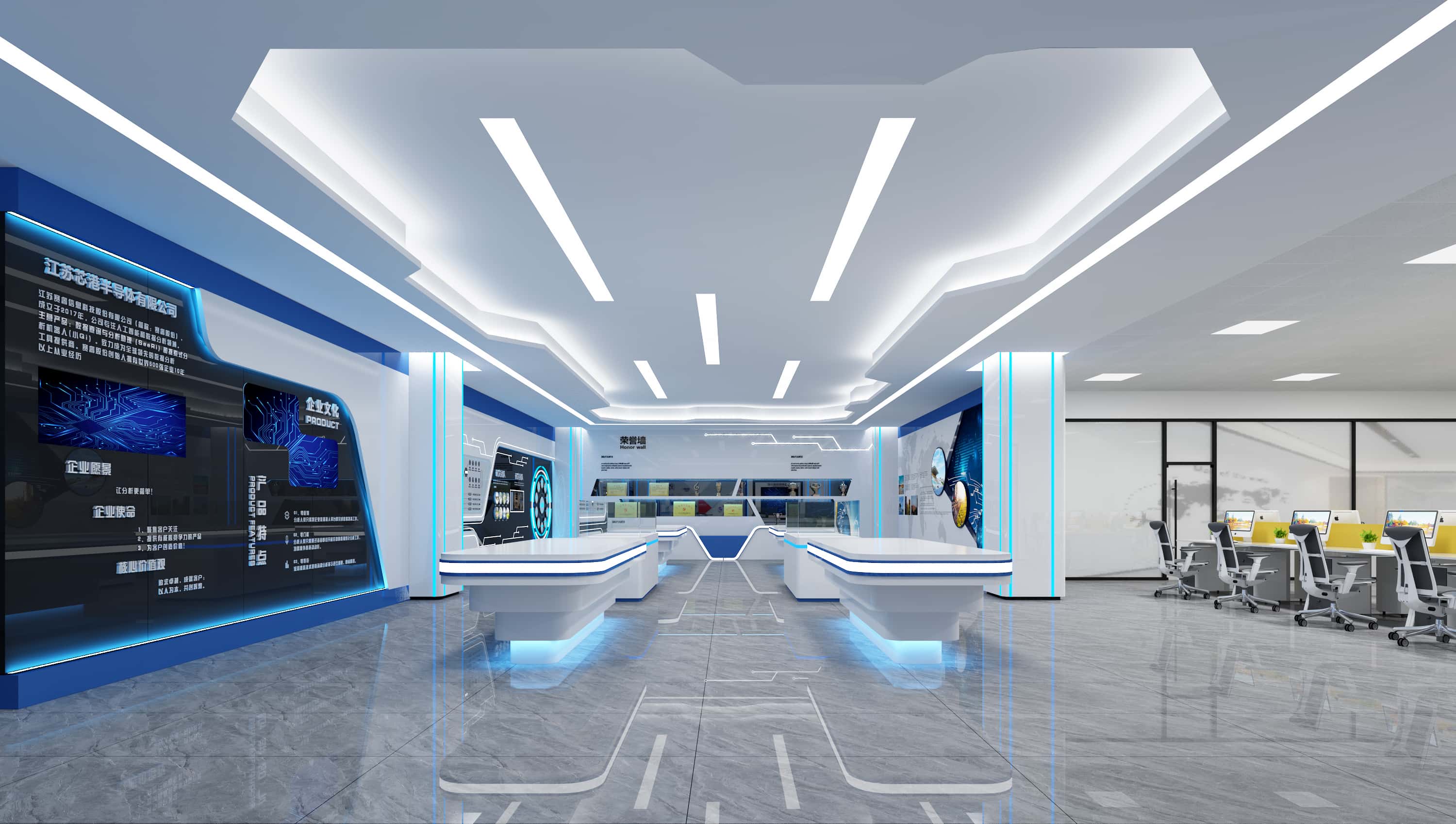 展廳區(qū)域,藍(lán)白配色凸顯科技感,墻面展板結(jié)合多媒體設(shè)備,全面展示企業(yè)信息,展示臺(tái)造型獨(dú)特,燈光設(shè)計(jì)增強(qiáng)空間立體感,打造出一個(gè)充滿科技與未來(lái)感的展示空間。