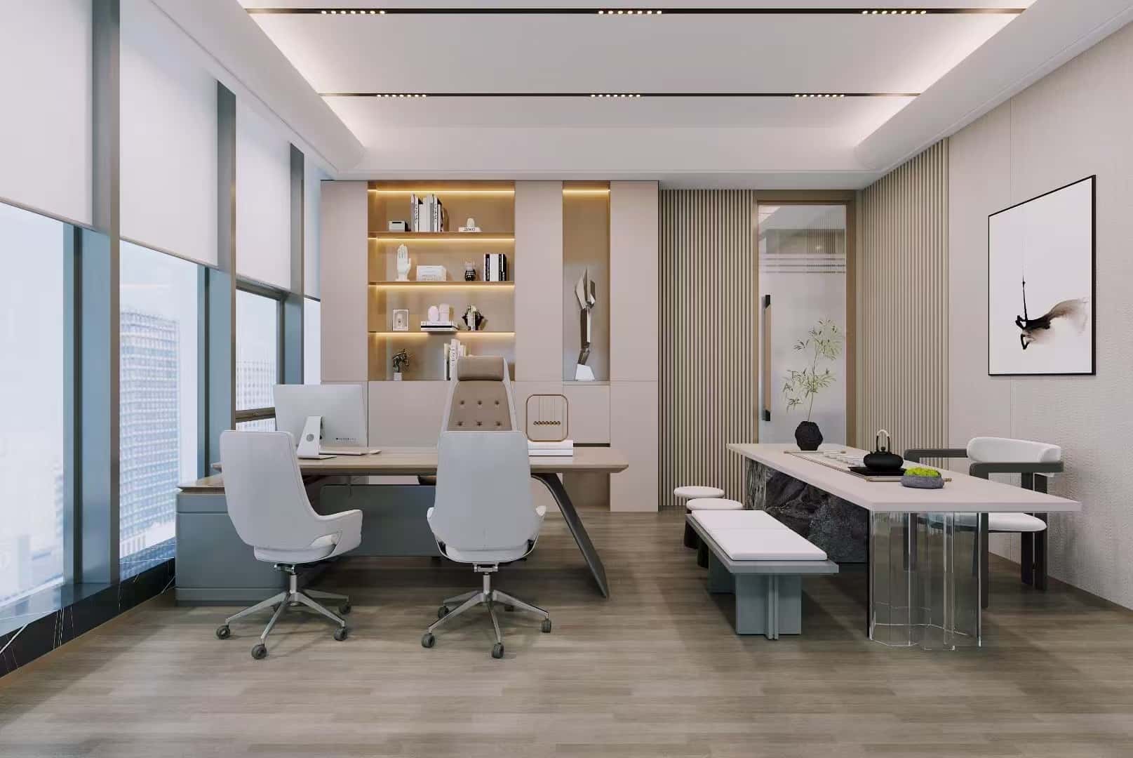 辦公家具選擇簡(jiǎn)約而富有設(shè)計(jì)感的款式,辦公桌、辦公椅及沙發(fā)等家具的顏色搭配和諧,營(yíng)造出舒適的辦公氛圍。書(shū)架上擺放的書(shū)籍、裝飾品等,豐富了空間的文化內(nèi)涵,展現(xiàn)出企業(yè)的品味與格調(diào)。部分辦公室內(nèi)的背景墻裝飾有大幅山水畫(huà)或藝術(shù)畫(huà)作,如長(zhǎng)城畫(huà)作、駿馬畫(huà)作等,增添了藝術(shù)氣息與文化底蘊(yùn),體現(xiàn)了領(lǐng)導(dǎo)的品味與企業(yè)的文化內(nèi)涵。