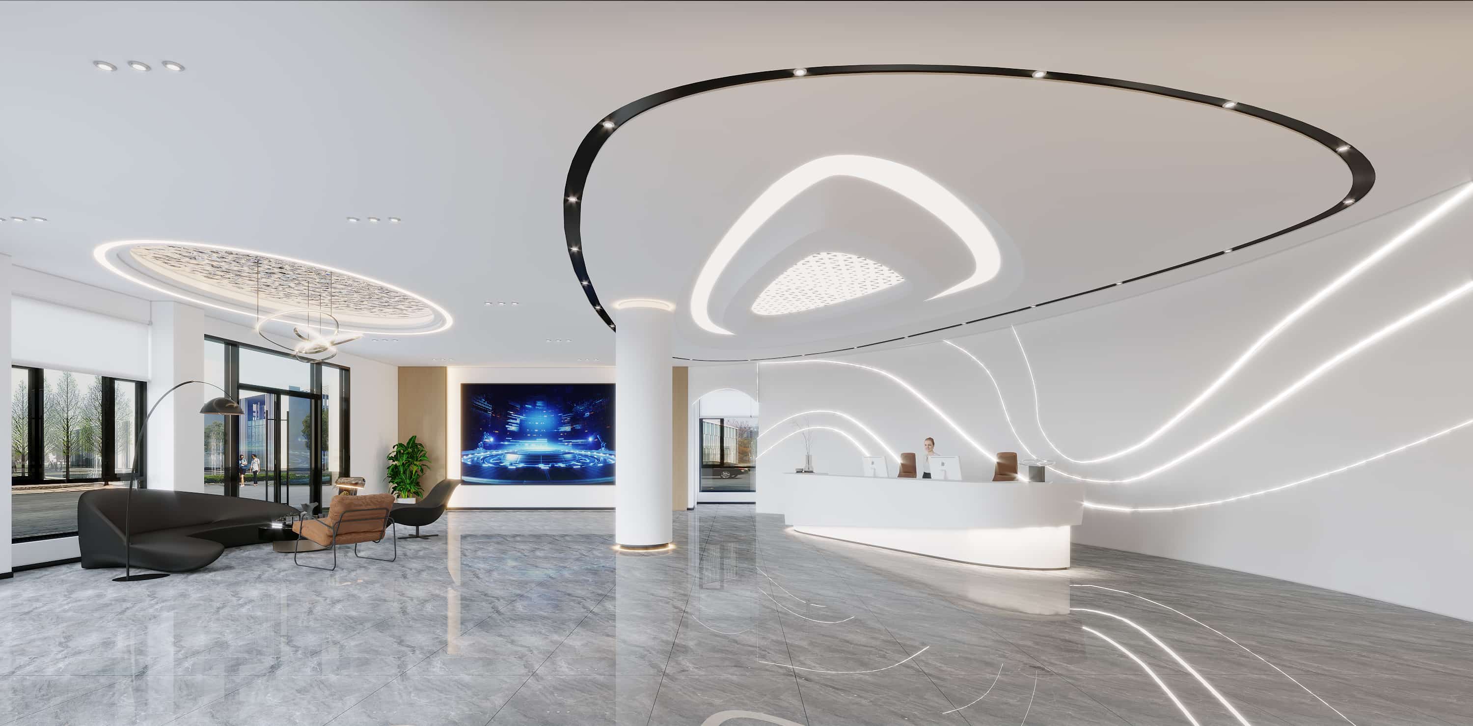 大廳:以白色為主色調(diào),搭配灰色大理石地面,營(yíng)造出簡(jiǎn)潔大氣的氛圍。天花板上獨(dú)特的弧形燈帶設(shè)計(jì),線條流暢,宛如藝術(shù)裝置,增添了空間的科技感與靈動(dòng)性。圓形吊燈精致美觀,與整體風(fēng)格相得益彰。大面積的落地窗引入充足自然光線,使空間更加明亮通透。接待臺(tái)造型簡(jiǎn)約現(xiàn)代,白色外觀干凈利落,后方的展示墻可用于陳列企業(yè)榮譽(yù)或產(chǎn)品,提升企業(yè)形象。休息區(qū)的黑色沙發(fā)與棕色座椅,為來(lái)訪者提供了舒適的等候空間。