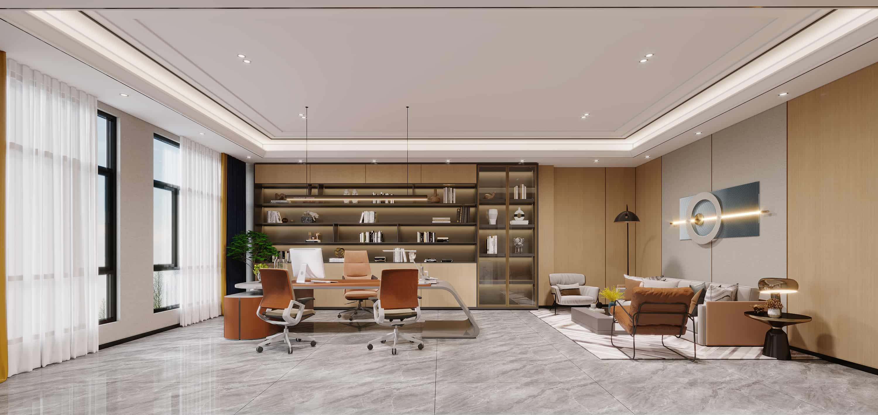 辦公室:采用米色與白色相結(jié)合的色調(diào),營(yíng)造出溫馨舒適的辦公環(huán)境。墻面的米色護(hù)墻板與地面的灰色大理石形成和諧搭配,天花板的燈帶設(shè)計(jì)簡(jiǎn)潔大方,提供了充足的照明。辦公桌椅造型現(xiàn)代,色彩與整體空間相呼應(yīng),書(shū)架上的書(shū)籍和裝飾品增添了文化氣息與生活質(zhì)感。窗邊的窗簾可調(diào)節(jié)光線,保證辦公環(huán)境的舒適性。