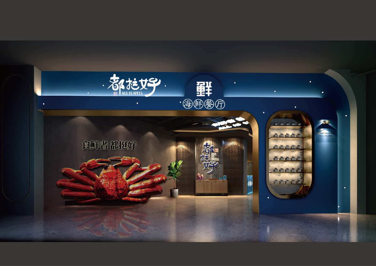 室內(nèi),天花板的波浪造型、墻面的海洋風(fēng)格裝飾以及地面的魚(yú)形圖案,處處呼應(yīng)海洋主題。燈光設(shè)計(jì)巧妙,柔和且富有層次感,增強(qiáng)空間的立體感與氛圍感。桌椅色彩搭配和諧,為顧客提供舒適的就餐環(huán)境。整體設(shè)計(jì)將海洋元素與現(xiàn)代風(fēng)格相結(jié)合,打造出一個(gè)既時(shí)尚又充滿海洋氣息的海鮮餐廳,讓顧客仿佛置身于海底世界,享受美食與美景。