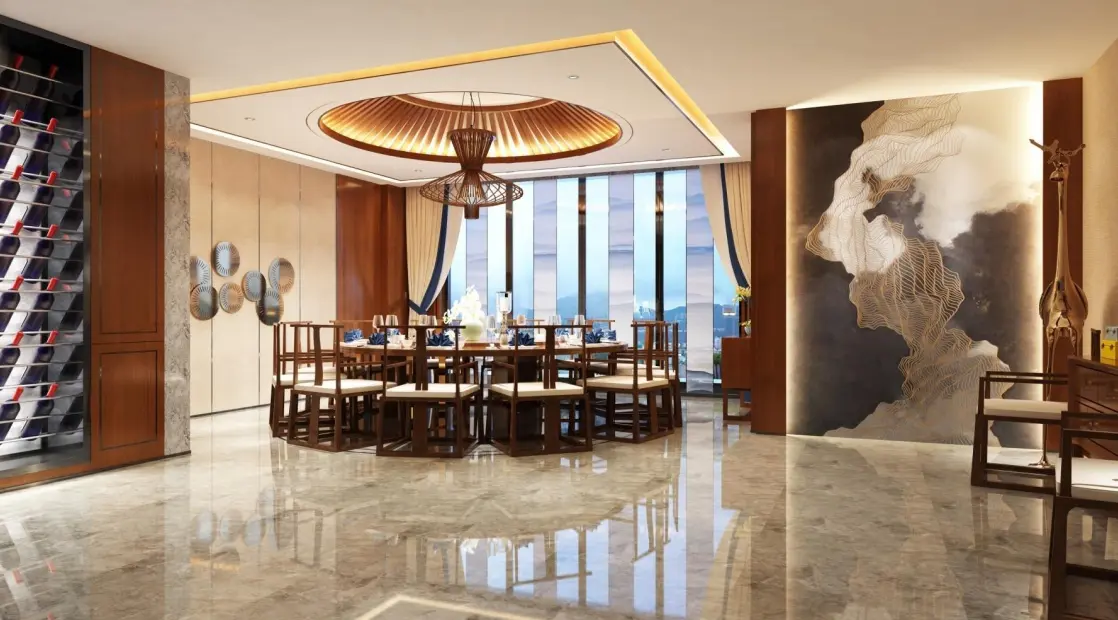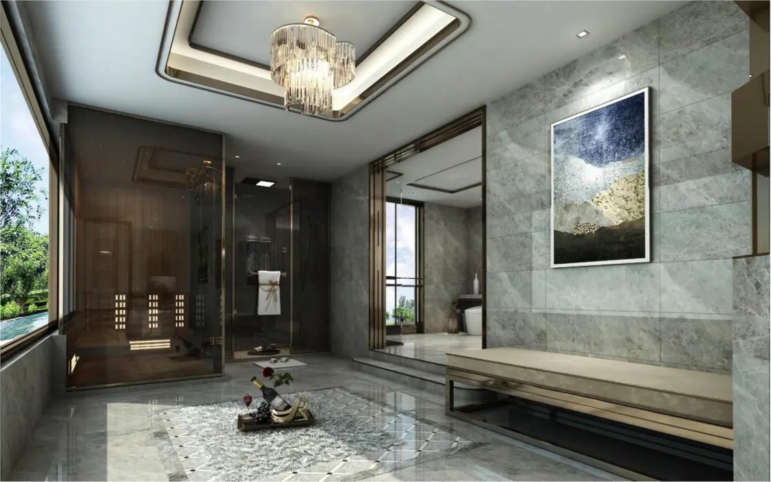 客廳區(qū)域,挑高設(shè)計搭配大理石背景墻與中式吊燈,盡顯大氣與典雅。中式家具與現(xiàn)代元素融合,營造舒適氛圍。