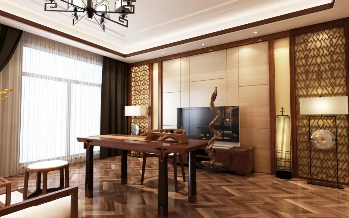書房,深色木質(zhì)家具古樸莊重,書架陳列豐富,搭配中式燈具與裝飾畫,營造靜謐的學(xué)習(xí)與工作氛圍。