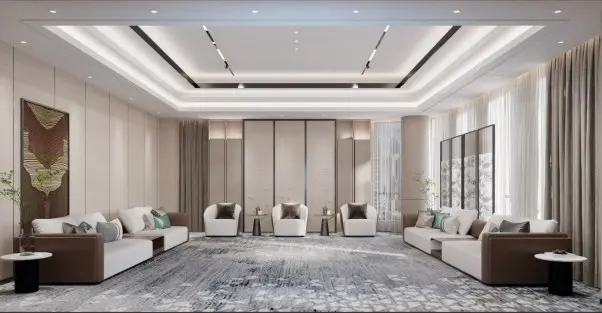 公司大門簡潔大氣,弧形設計與直線條結合,彰顯現(xiàn)代感與穩(wěn)重。大堂以金色為主調(diào),搭配綠植與藝術裝置,營造出高端且富有生機的氛圍。接待室布置舒適沙發(fā)與精致裝飾,營造溫馨洽談環(huán)境。會議廳整齊排列座椅,簡潔實用,滿足會議需求。展廳則運用流線型元素與科技感燈光,展示產(chǎn)品與企業(yè)形象,增強互動體驗。整體設計風格統(tǒng)一,既體現(xiàn)企業(yè)實力與專業(yè)性,又融入人文關懷與現(xiàn)代科技元素,打造舒適且富有魅力的企業(yè)空間。